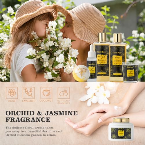 - Fresh Orchid and Jasmine Floral scent gift set Luxury Christmas Gifts for Women. beauty baskets for women gift Gently crafted with fragrances of Fresh Orchid and Jasmine Floral scents. This tropical scent creates a delightful aroma. Honey is extremely moisturizing and hydrates even the driest of skin. Almonds are rich in Vitamin E which nourishes and softens skin