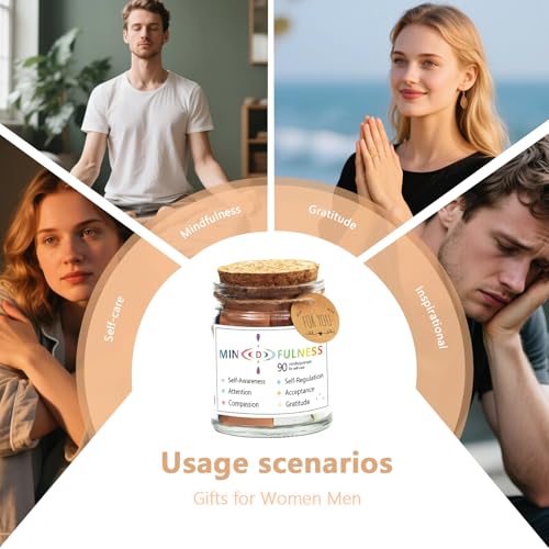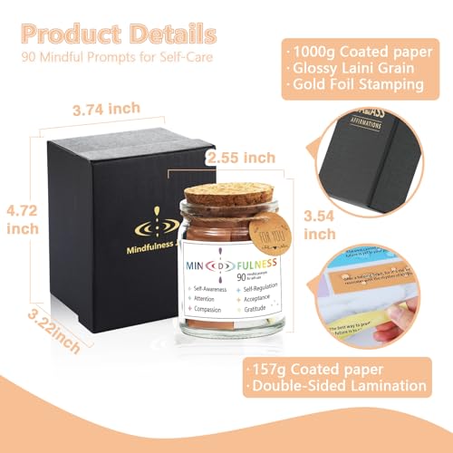 - 【Affirmation Jar for Women-Self Care Gifts】Each mindfulness prompt gently steers you toward deeper self-awareness,stronger emotional regulation.It's self-care that fits in your palm-helping you carve out moments for reflection and thrive through intentional thinking.Whether drawn in the morning to set a positive tone or used as a bedtime reflection tool,it fosters mindfulness by prompting intentional pauses amid daily chaos,making it a powerful ally for anxiety relief and emotional balance