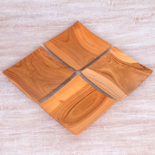 NOVICA Artisan Handmade Teak Wood Plates Square from Bali Set of 4 Brown Indonesia Tableware Dinnerware Dessert Natural Ma...