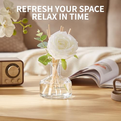 - Complete Reed Diffuser Set Includes: (1) 7.1oz (210ml) natural fragrance concentrates (210ml); (2) simple but unique design glass bottle; (3) an artificial rose; (4) a simulated eucalyptus; (5) 7 reed diffuser sticks; (6) an adjustable satin ribbon. Everything needed for stylish home fragrance decor.