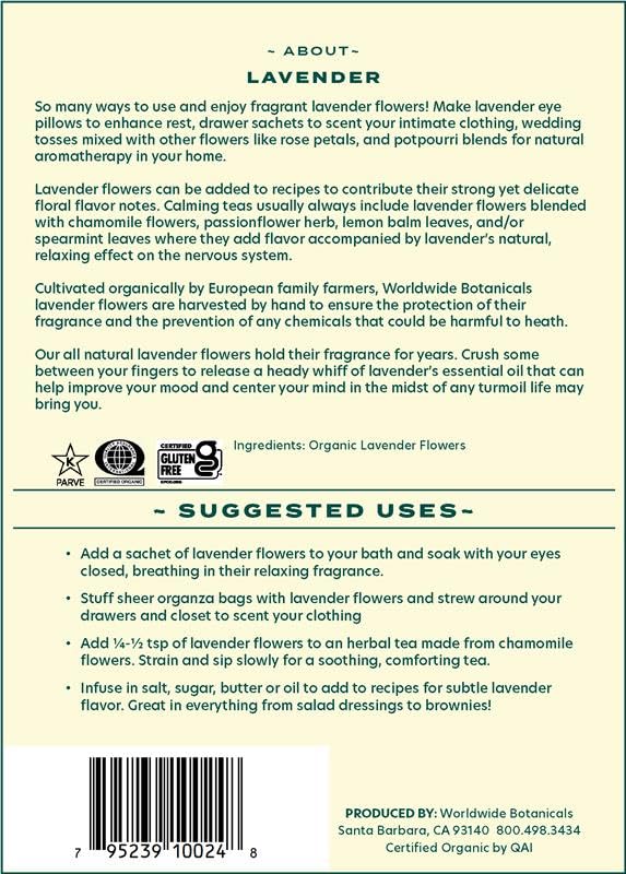 Worldwide Botanicals Organic Lavender Flowers, 4 ounces, Pure European Lavender buds, Perfect for Aromatherapy, Sachets, W...